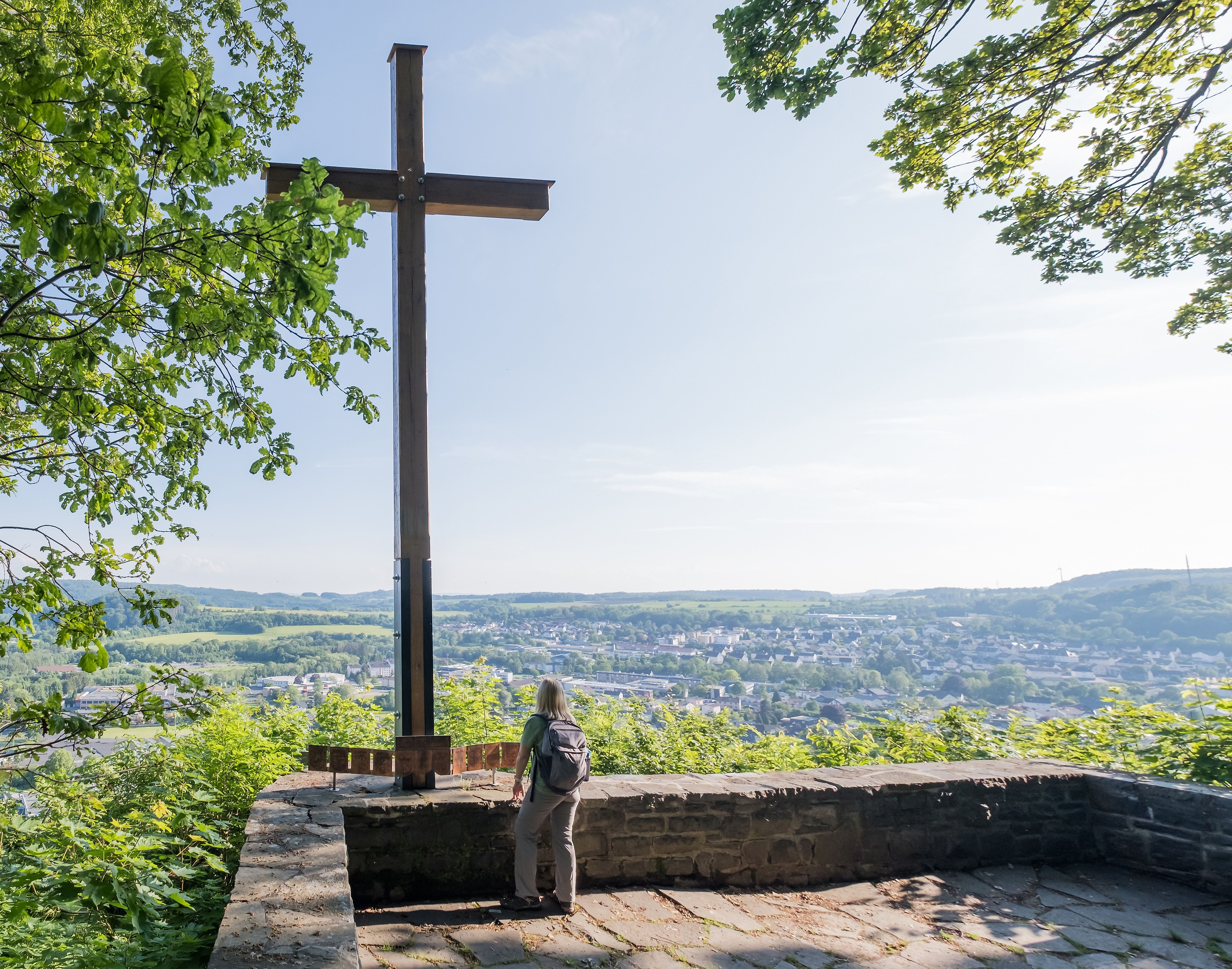 The highlight of this stage is the Holzbach Gorge. The entrance to the gorge is located at the Dappricher Hof near Seck. The Holzbach, a tributary of the Elbbach, has carved its way deeply into the basalt here before flowing past Gemünden towards Hessen. The gorge is about one kilometer long and up to 20 meters deep. Fallen basalt blocks and uprooted trees give the narrow valley a wild stream-like character. Information boards along the gorge help you identify the local plants and animals. Gentle hills, extensive deciduous forests, and wide meadow valleys characterize the region around Westerburg. Passing the campsite and the inn “Zum Katzenstein,” you now hike along narrow paths through the forest to the Katzenstein, a rock made of plate basalt. Here stands a monument for the expellees from the former German eastern territories. It offers a wonderful view over Westerburg all the way to the Taunus range. Soon you reach the end of the stage at the eastern edge of the town. From here, you can quickly reach the town center by a marked side path.
