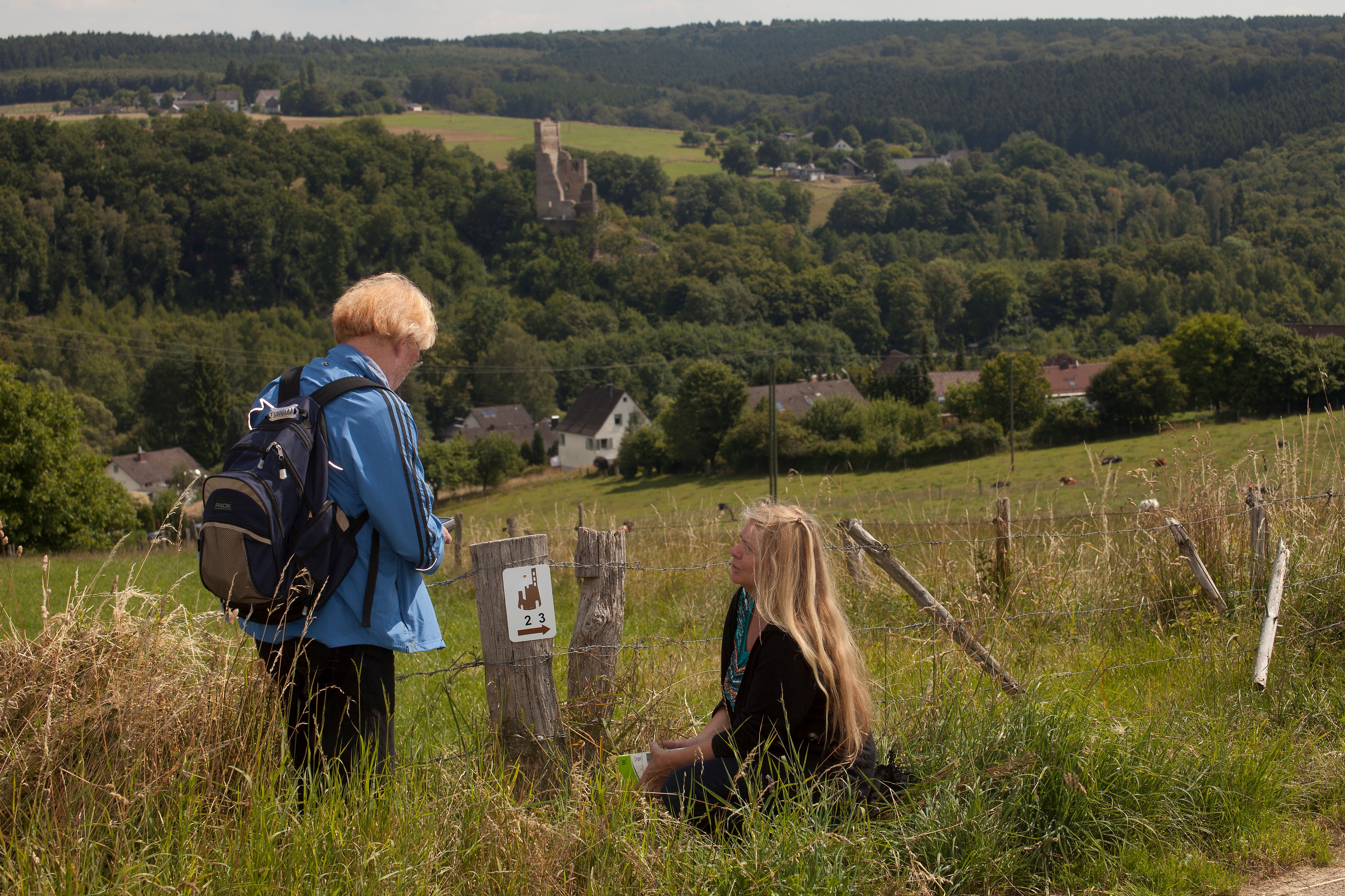 Burgweg 2 op het platteland van PuderbachVanaf het beginpunt lopen de drie kasteelpaden (1+2+3) nog steeds samen. Vanaf hier leidt de Burgweg bergopwaarts naar Steimel. Eenmaal in Steimel komt de route langs "Haus Neitzert", waar kunstwerken van Karl Bruchhäuser te bezichtigen zijn (www.bruchhaeser-stiftung.de). De route gaat verder via het marktplein, waar in de herfst de landelijk bekende Steimelse aardappelmarkt plaatsvindt. Vanaf daar gaat de route verder door het bos in de richting van Reichenstein. Het pad leidt direct langs de ruïnes van kasteel Reichenstein. De ruïnes kunnen op afspraak worden bezocht (www.burgruine-reichenstein.de). De kasteelwegen 2+3 leiden in Reichenstein omhoog naar de districtsweg tussen Dürrholz en Döttesfeld. Na het oversteken van de districtsweg daalt de route af in het idyllische Werlenbachtal. Hier scheiden de twee paden. Burgweg 2 leidt nu door het Werlenbachtal naar het natuurontdekkingspad Dürrholz. In delen loopt de Burgweg over het terrein van het pad. Een apart bezoek aan het natuurpad wordt aanbevolen. Daarna loopt de route gedeeltelijk door het dorp Daufenbach om even later op het pad langs de bosrand te genieten van verre uitzichten in het Siebengebirge. De route gaat verder over prachtige bospaden terug naar het beginpunt in Puderbach. De Burgweg 2 heeft een lengte van ongeveer 16,5 km.