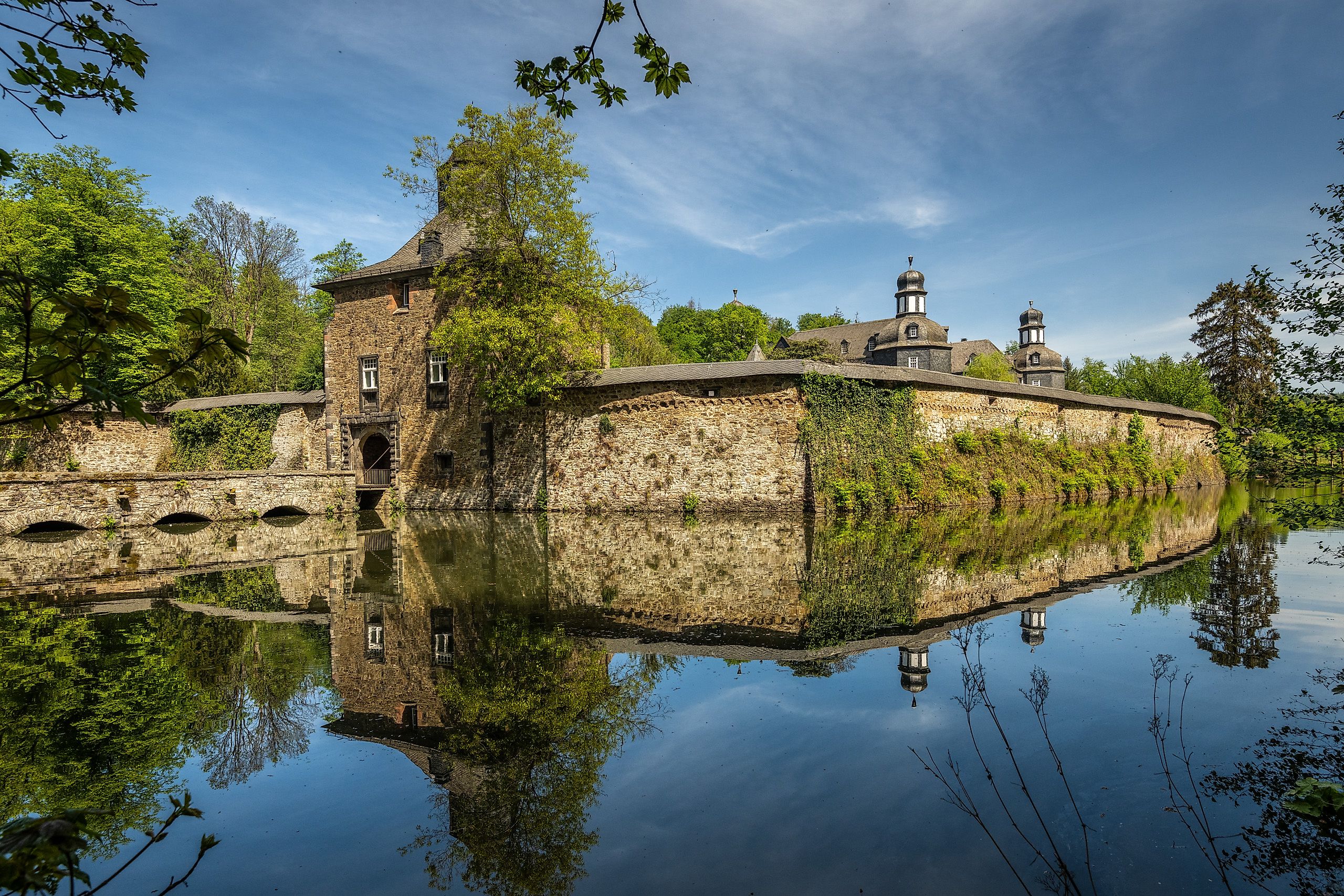 Vanaf de parkeerplaats bij het sportveld in Friesenhagen leiden de rood-witte markeringen van het Heksenpad je eerst door de Klosterstrasse naar de barokke St. Sebastianuskerk. Sebastianus. De route loopt verder door het dorp en een klein stukje langs de hoofdweg en buigt dan af langs kruiswegstaties en door het bos naar de Kruiskapel op de Schnabelberg. Het is privébezit en wordt beschouwd als een van de mooiste en best bewaarde waterburchten in het Rijnland. Voordat je de beek Wildenburger Bach oversteekt, wacht je een literaire verrassing: de Amerikaanse conceptuele kunstenares Jenny Holzer heeft zichzelf hier vereeuwigd met een gedicht in een grot. Je gaat verder langs de slotgracht, steekt de weg over, langs het Landgasthof Wildenburger Hof en vanaf hier een steil stuk bergopwaarts de bossen rond Friesenhagen in. Na een korte klim opent zich een breed, gemakkelijk toegankelijk bospad. Een geasfalteerde weg voert je over de beek Nädringer Bach, waarna een rustiek zandpad zich langs de bosrand een weg baant naar de Rollsberg. Bij de Rochuskapel nodigt het panoramische uitzicht uit tot een pauze. Met uitzicht op de Wildenburg loop je via een rustig weggetje het dal in. Als je de Wildenburger beek oversteekt, bereik je via een licht stijgend bospad de Ziegenschlade en nu is het nog maar een steenworp omhoog naar de Blumenberg en de Rode Kapel, die rond 1690 werd gebouwd ter herinnering aan de heksenprocessen in Wildenburg. De meer dan 400 jaar oude “heksenlinde” werd in 2021 door een storm verwoest. Via een weidepad van de zogenaamde Blumenberg bereik je eerst de straat “Zur Linde” en dan direct terug naar je startpunt bij het sportveld.