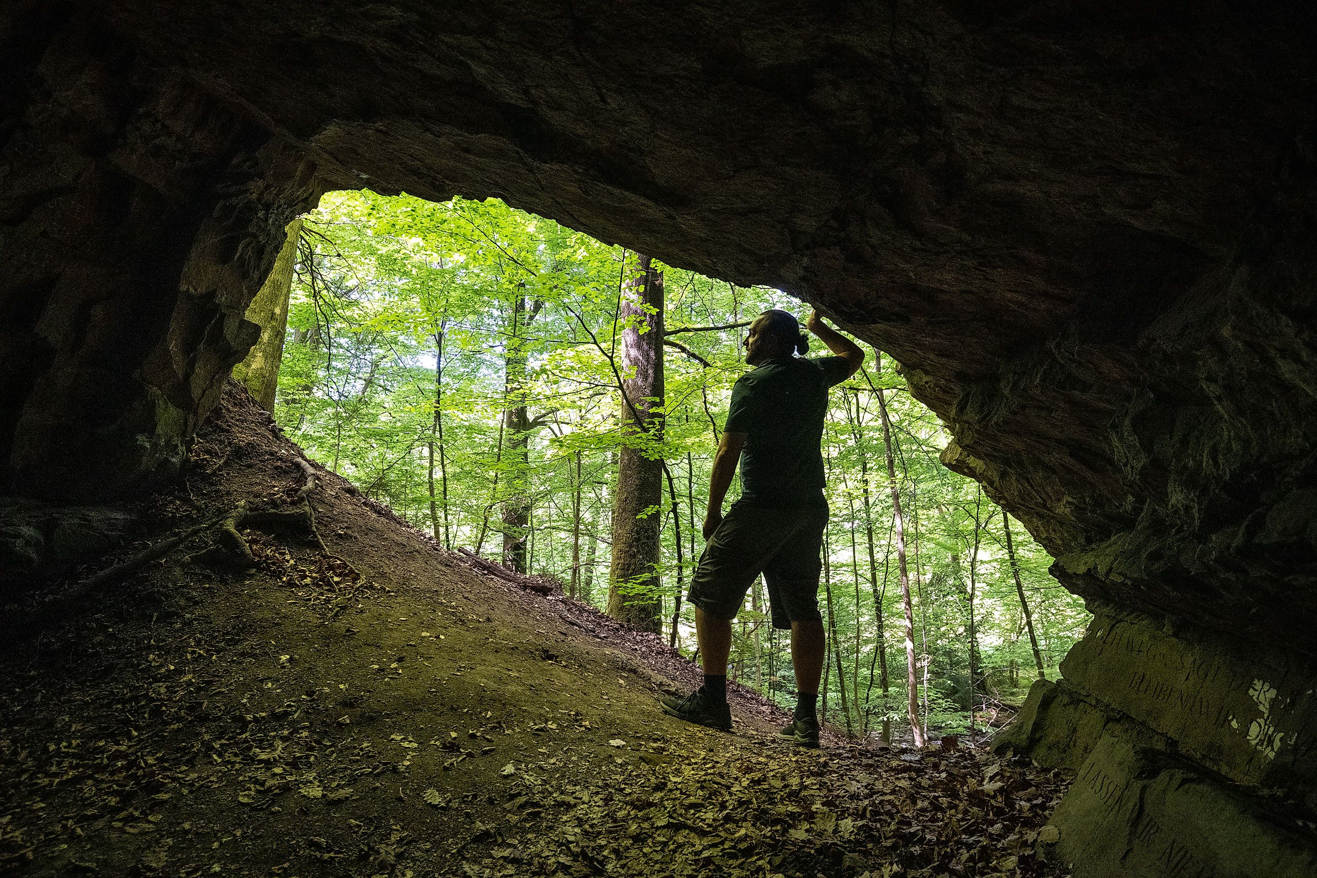 Installatie van conceptueel kunstenaar Jenny Holzer in een grot bij de Wildenburger Bach vlakbij kasteel Crottorf.