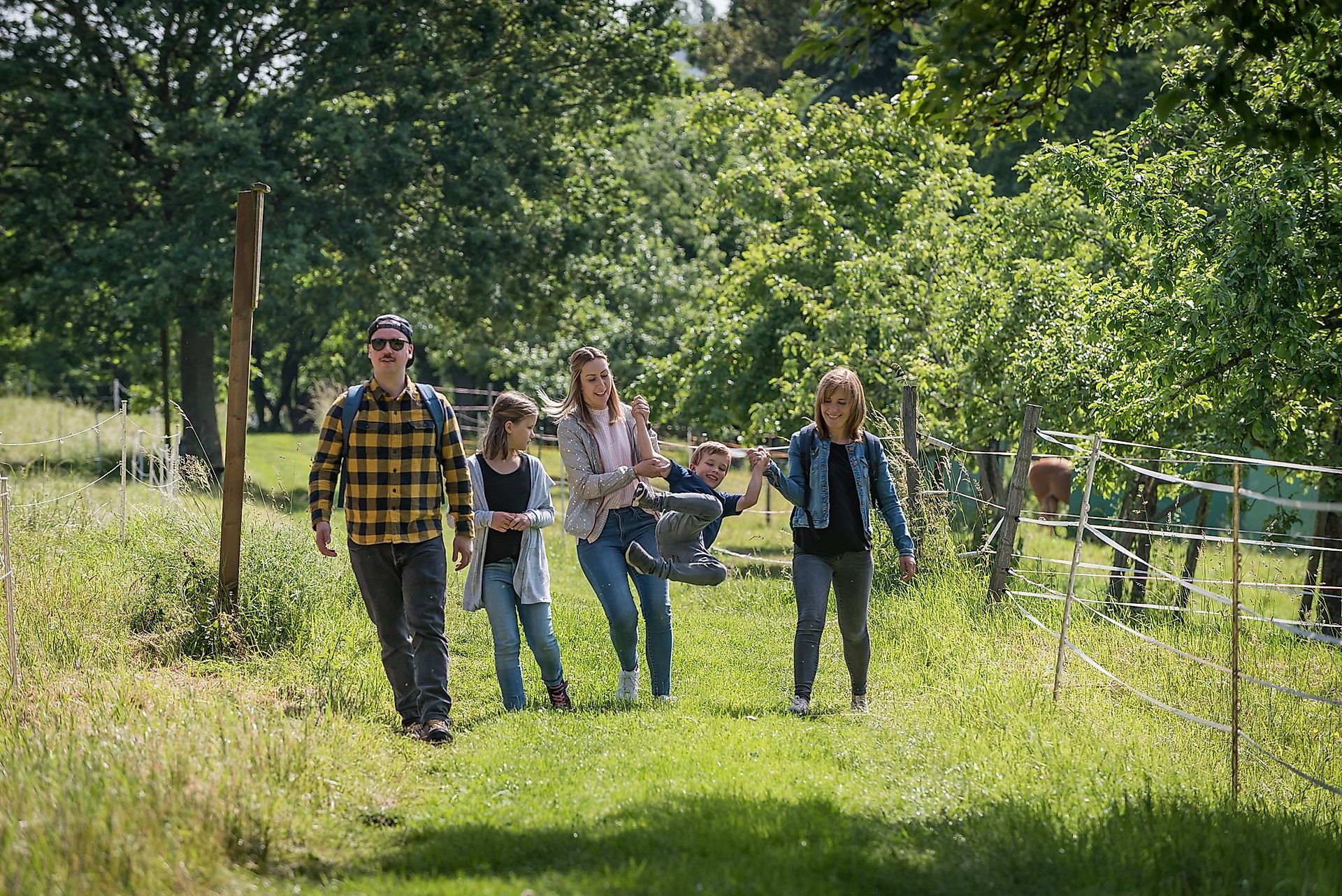 Een leuk wandelpad voor kinderen. Appelvariëteiten worden gaandeweg uitgelegd. Bankjes en groene weilanden nodigen u uit om er even tussenuit te gaan. Paarden en koeien bieden de kinderen de mogelijkheid om ter plaatse de dieren te aaien. Een avonturenparcours voor het hele gezin. De Zwergenweg is ook goed te belopen met een kinderwagen.